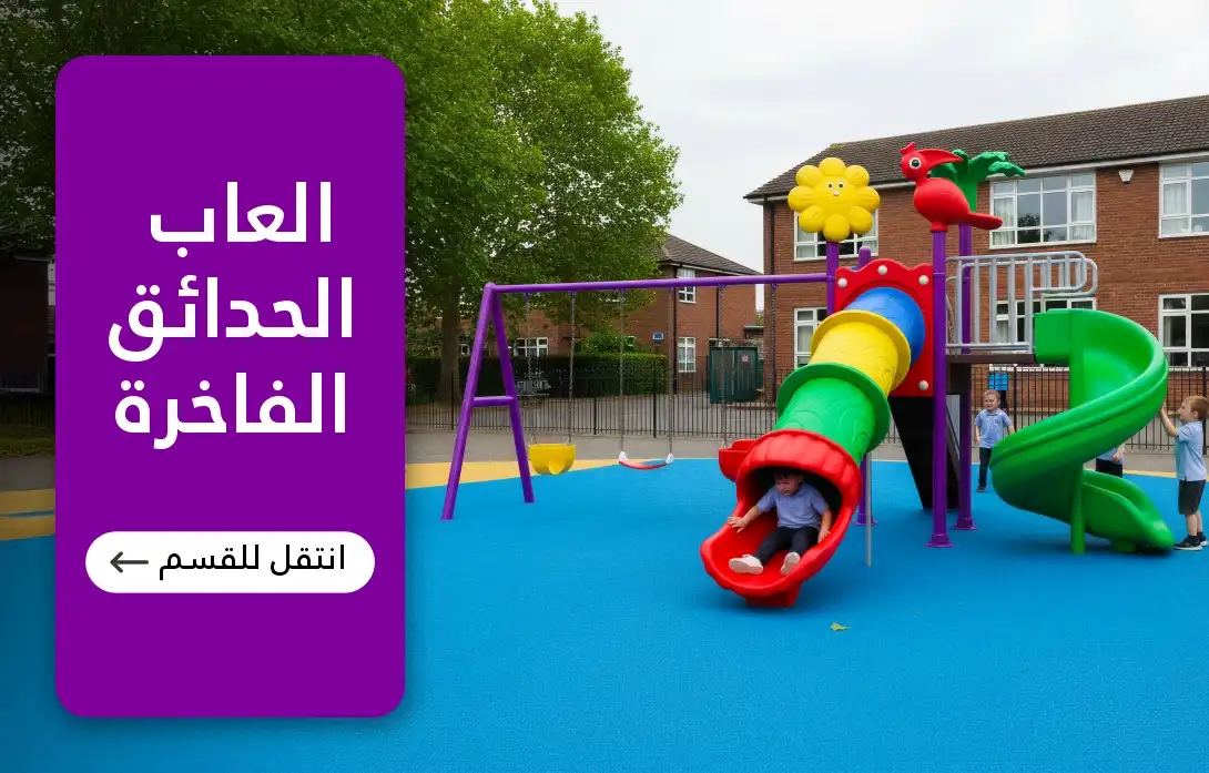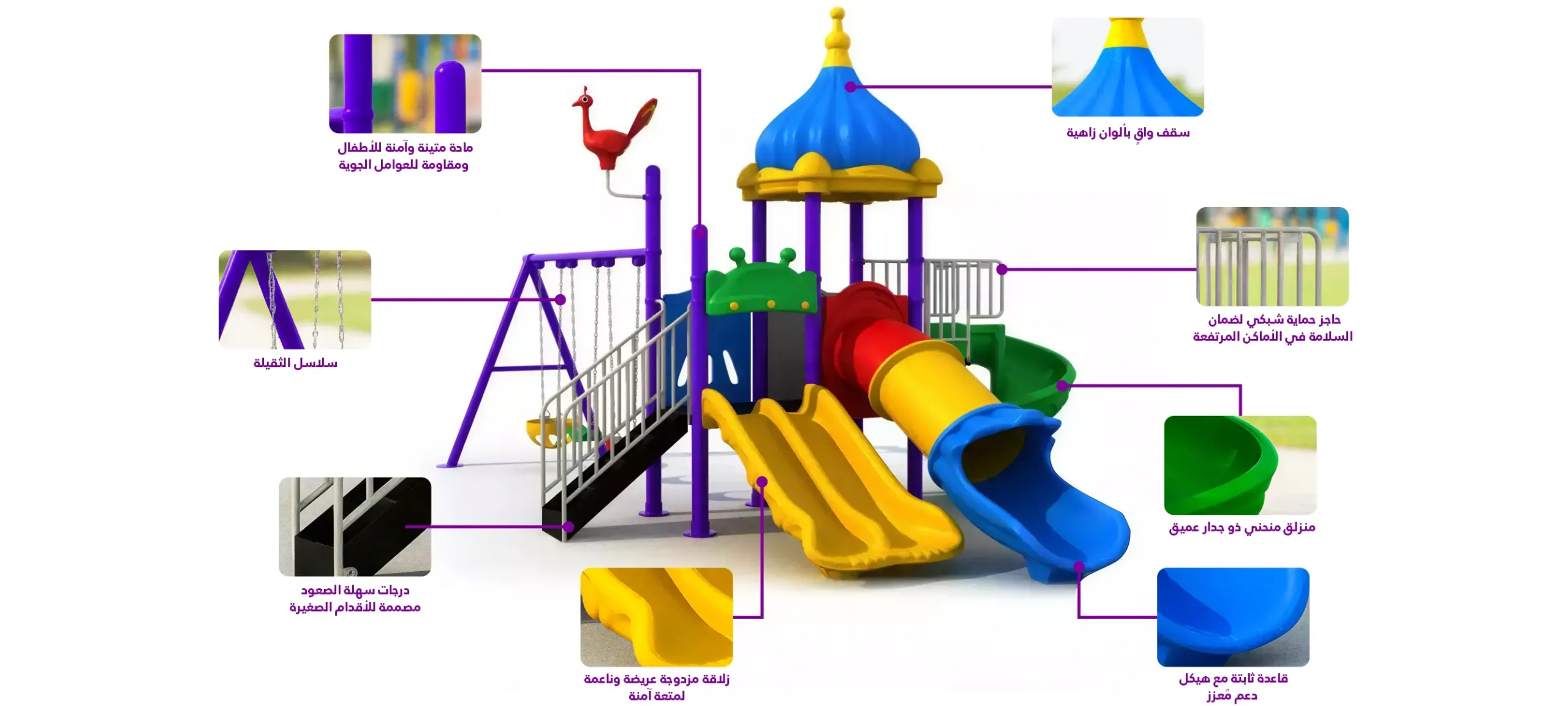 مجموعة لعب للأطفال تضم مرجيح وزحليقة مع برج ملون وثلاث مراجيح.