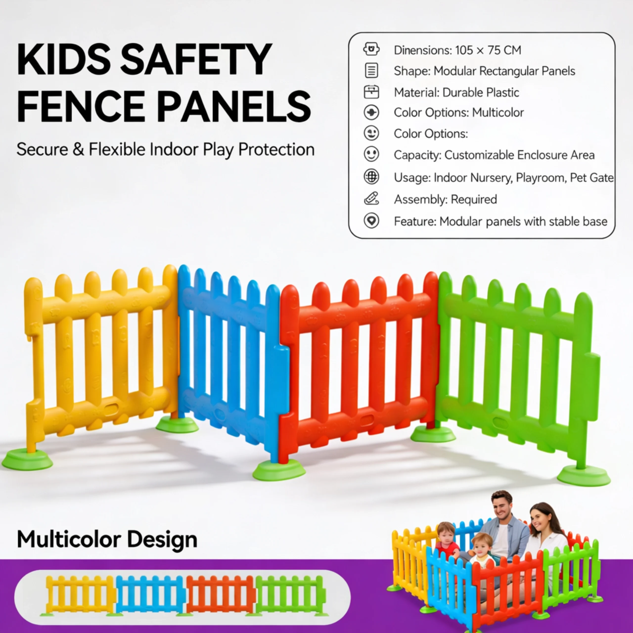 Create a safe and flexible play area for your child with these Kids Safety Fence Panels, designed for both indoor and outdoor use. Made from durable, non-toxic HDPE plastic, the panels feature smooth, rounded edges for child safety and a sturdy base for stability on tiles, carpets, or grass. The modular design allows you to customize shapes and sizes to fit your space, whether in a living room, playroom, or garden. With a simple snap-together system, setup takes minutes without tools, and the lightweight structure makes it easy to move or store when not in use.
