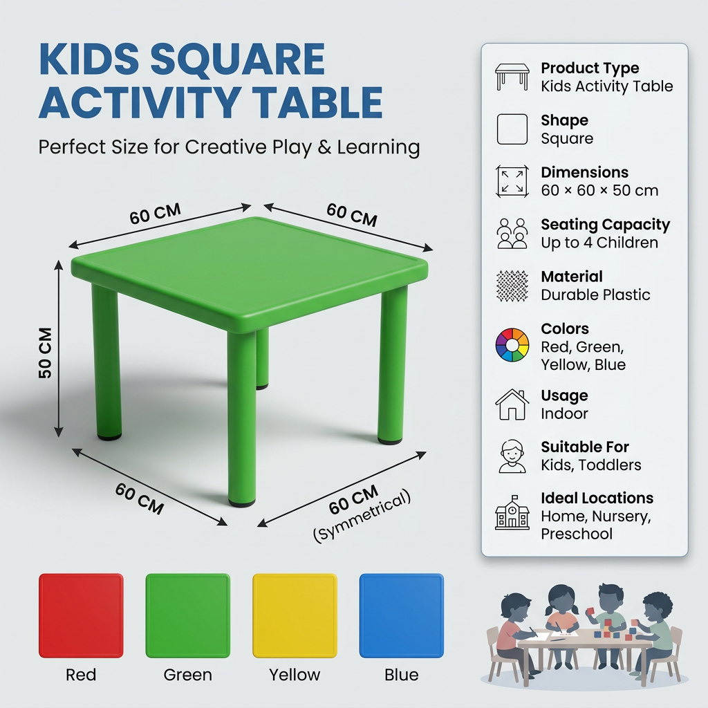 Kids Plastic Square Activity Table for 4 | Durable Classroom & Play Table (60x60cm)