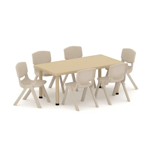 Rectangular kids activity table set with six chairs, ideal for classrooms, nurseries, and group learning activities.