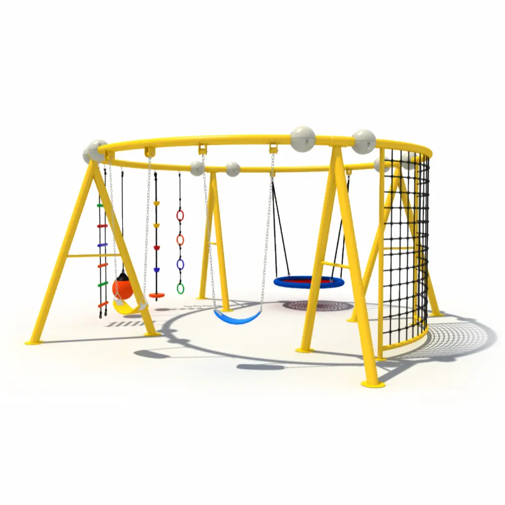 This circular outdoor playground system is designed for complete group play experiences. Featuring multiple swings, a climbing net, and interactive elements, it promotes balance, strength, coordination, and social interaction in public playgrounds.